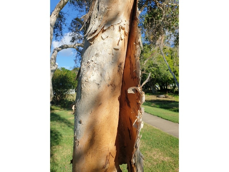 Found in eastern Australia and the Pacific Islands, this tree’s specific name refers to its stiff, dark green leaves that usually have five longitudinal veins and are broad in contrast to many other fine leafed Melaleuca species. This tree is notable for its pale orange, brown papery bark that peels in patches. It grows along stream banks and swamps and can reach a height of 25 metres. It is durable in water and has been used for house stumps and fence posts. The oil extracted from the leaves has a high eucalyptol content and is used in inhalants and liniments.
