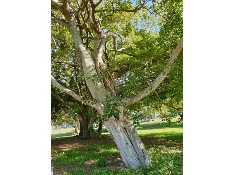 Long drooping branches of the Weeping Fig have contacted the damaged trunk of the Rusty Fig, forming a growth bond in the trunk of the latter. The final result of this actively growing bond is unknown, although the Weeping Fig appears likely to be the younger but more vigorous of the interspecies relationship. The two trees share a common “crown”, appearing as one tree until the observer notices the presence of two contrasting foliage shapes and sizes. A further feature of the Weeping Fig is an unusual branch connection with the adjacent Weeping Fig (next tree along the path towards caravan park) where long laterals of both trees have crossed, rubbed and fused.