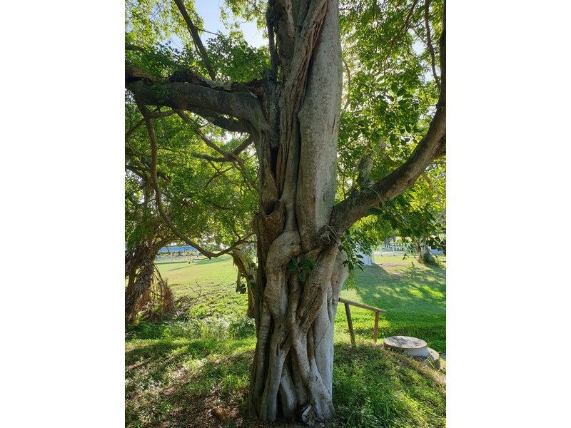 Long drooping branches of the Weeping Fig have contacted the damaged trunk of the Rusty Fig, forming a growth bond in the trunk of the latter. The final result of this actively growing bond is unknown, although the Weeping Fig appears likely to be the younger but more vigorous of the interspecies relationship. The two trees share a common “crown”, appearing as one tree until the observer notices the presence of two contrasting foliage shapes and sizes. A further feature of the Weeping Fig is an unusual branch connection with the adjacent Weeping Fig (next tree along the path towards caravan park) where long laterals of both trees have crossed, rubbed and fused.