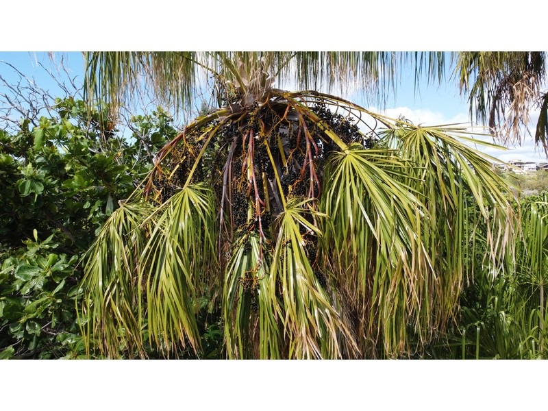 These trees typically occur in colonies along streams or near swamps in Queensland from about Townsville to Noosa. They grow to 25 metres, produce bright yellow flowers and fruit that is black when ripe. Fruit is eaten by fig birds, fruit doves, pigeons and scrub turkeys. First Nation peoples used the leaves and fibrous leaf base for weaving. New shoots from the centre of the crown are edible, but removal can kill the palm. These trees are quite common in and around the Capricorn Coast and associated islands. There are typical stands of these palms along the Scenic Highway at Kinka Beach.